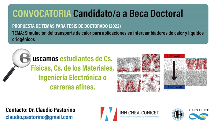 El transporte de calor en procesos de ebullición y condensado es central para la transición energética. Mejorarlo permite optimizar los intercambiadores de calor en reactores nucleares. Además, optimizar el enfriamiento de líquidos criogénicos posibilita su uso más eficiente como vector energético (hidrógeno). Se propone estudiar por simulaciones de dinámica molecular el transporte de calor a través de interfases líquido-vapor y los cambios provocados si se nano-estructuran las superficies confinantes o se las reviste con agregados poliméricos.