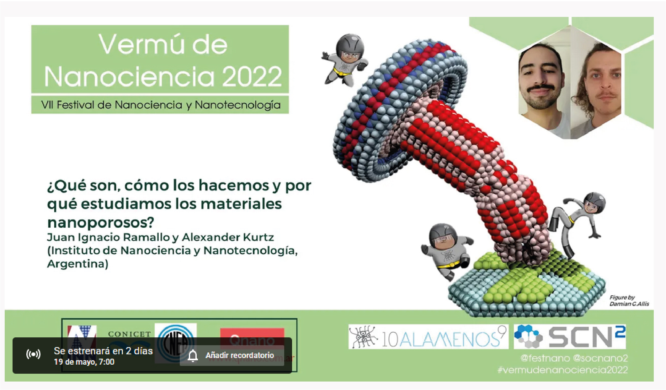 Juan Ignacio Ramallo y Alexander Kurtz, becarios del INN, realizaron un corto audiovisual que será presentado de forma virtual en el Vermú de Nanociencia 2022, dentro del Festival Internacional 10alasmenos9, este jueves 19 de mayo a las 12 hs. (España) y 7 hs. (Argentina), denominado: